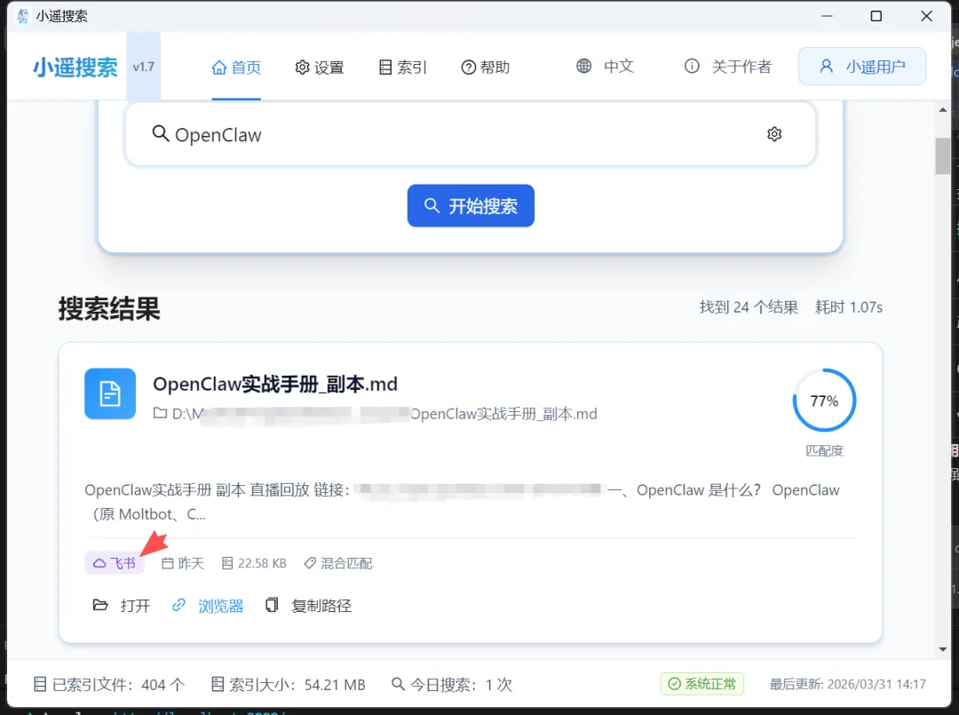 小遥搜索会自动识别这些元数据,并将文档标记为”飞书”数据源。