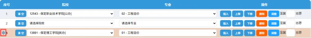 ②插入。点击“插入”按钮,可在当前行新增一行空志愿,当前行及之后志愿信息全部整体下移一行。