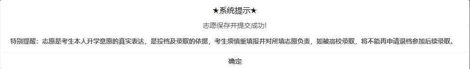 密码校验成功后,系统会进行“志愿保存并提交成功”提示,如图11所示。请考生认真阅读相关提醒,并点击“确定”按钮,进入志愿详情页面。