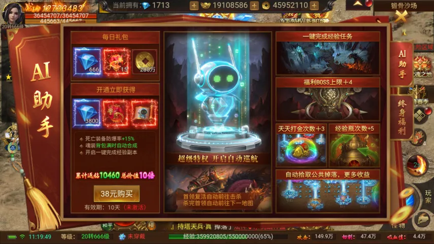 只需要三十八就可开启,虽然有效期只有10天,但是性价比还是很高的。开启后还可获得精灵皮肤与自动拾取功能,这个自动拾取是专门为了那些特殊BOSS出的,毕竟有一些BOSS击杀后掉落的道具还是需要一件一件拾取的;还可获得圣武☆赤霄炎龙珠并解锁神技:龙凤威国:受到暴击伤害时,有12%几率免疫本次伤害,并恢复自身10%的生命值,冷却120秒。还有死亡装备防爆率+15%,魂装背包满时自动合成,开启一键完成经验副本,福利BOSS上限+4,天天打金次数+3,经验瓶次数+5,首领复活自动前往击杀,击杀完成前往下一地图。所以AI助手可以说非常值得入手。