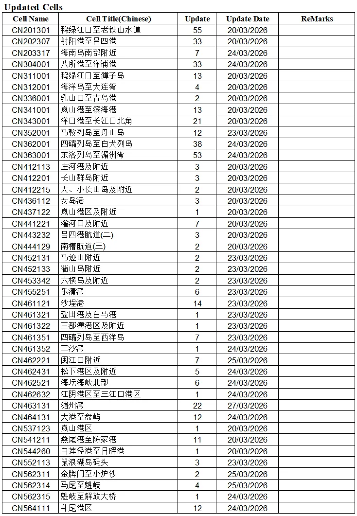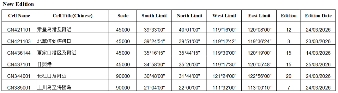 海事局电子海图数据更新说明 CN_WK13-26 海事版现已出版官方电子海图 553 幅,覆盖全国沿海所有航线和港口航道。官方电子海图每周更新一次。更新包括所有最新的改正通告内容和改版,新版电子海图。 舟山海图信息科技有限公司具有交通运输部东海航海保障中心上海海图中心一级代理授权,为用户每周提供最新的官方电子海图数据更新服务。 欢迎来电咨询,热线电话 18805800011 WK13-2026 数据更新列表