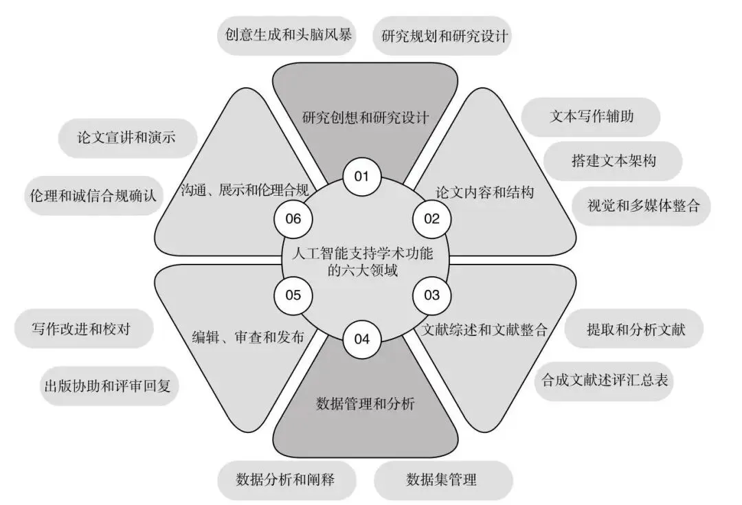 六是协助沟通、展示和伦理合规,包括协助论文宣讲和演示,协助剽窃检测等伦理和诚信合规确认。