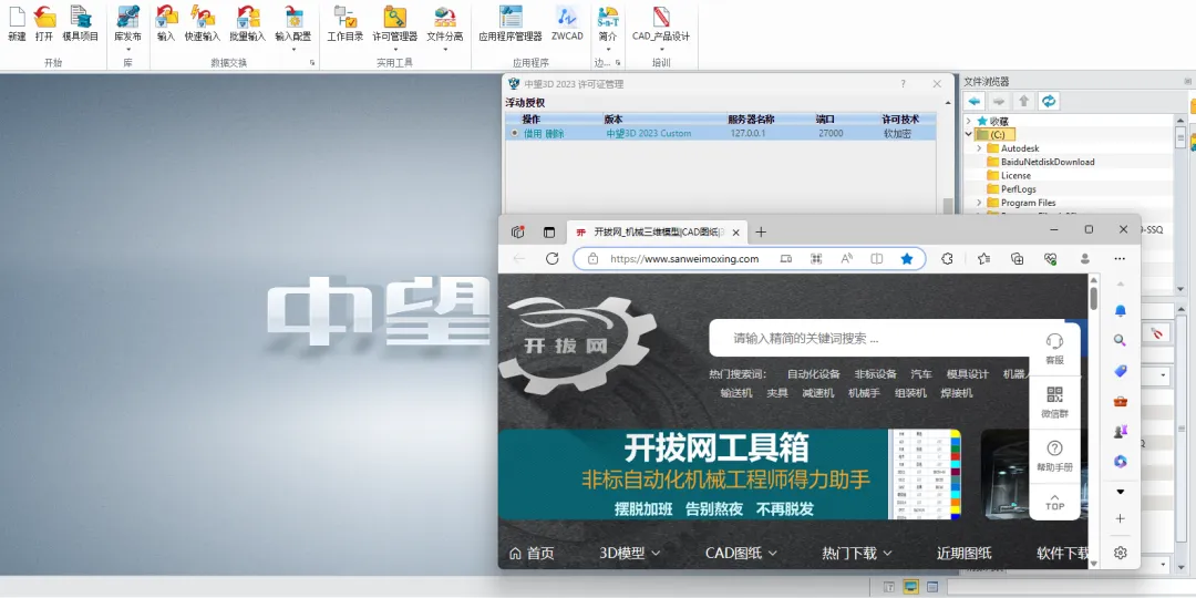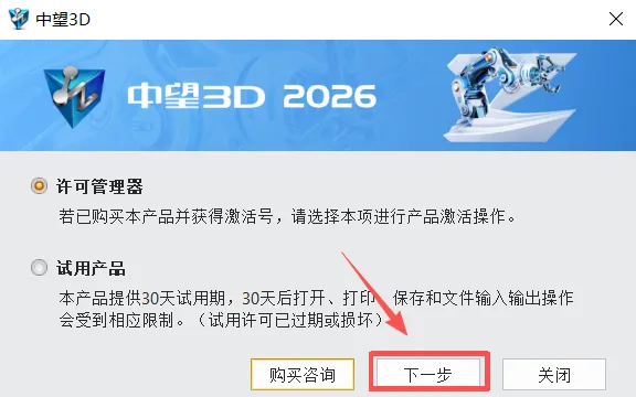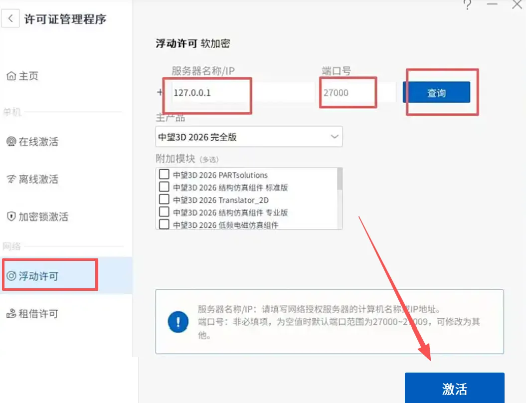 9、打开中望3D 2026,选择:许可证管理器→ 下一步 → 激活许可证 → 浮动许可证→ 服务器名称/IP:127.0.0.1 端口号:27000 → 查询→ 中望3D2026完全版→ 勾选所有附加模块