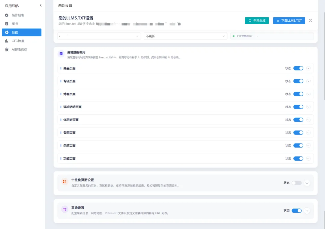正如 SEO 需要 sitemap.xml,AI 需要 llms.txt。 这是专为 AI 准备的“精简说明书”。SHOPYY 插件会每小时自动更新此文件,把网站的核心卖点、参数、FAQ 喂给 AI,让它快速读懂你的品牌。