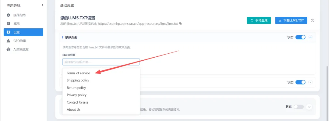 3.可选择商城种自定义页面的条款页面数据,上传至llms.txt文件中
