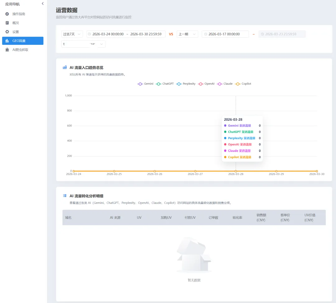 5.访问【GEO流量】,监控用户通过各大AI平台对您网站的访问流量进行监控,查看通过各类 AI(Gemini、ChatGPT、Perplexity、OpenAI、Claude、Copilot)访问网站的具体流量转化数据和销售业绩。