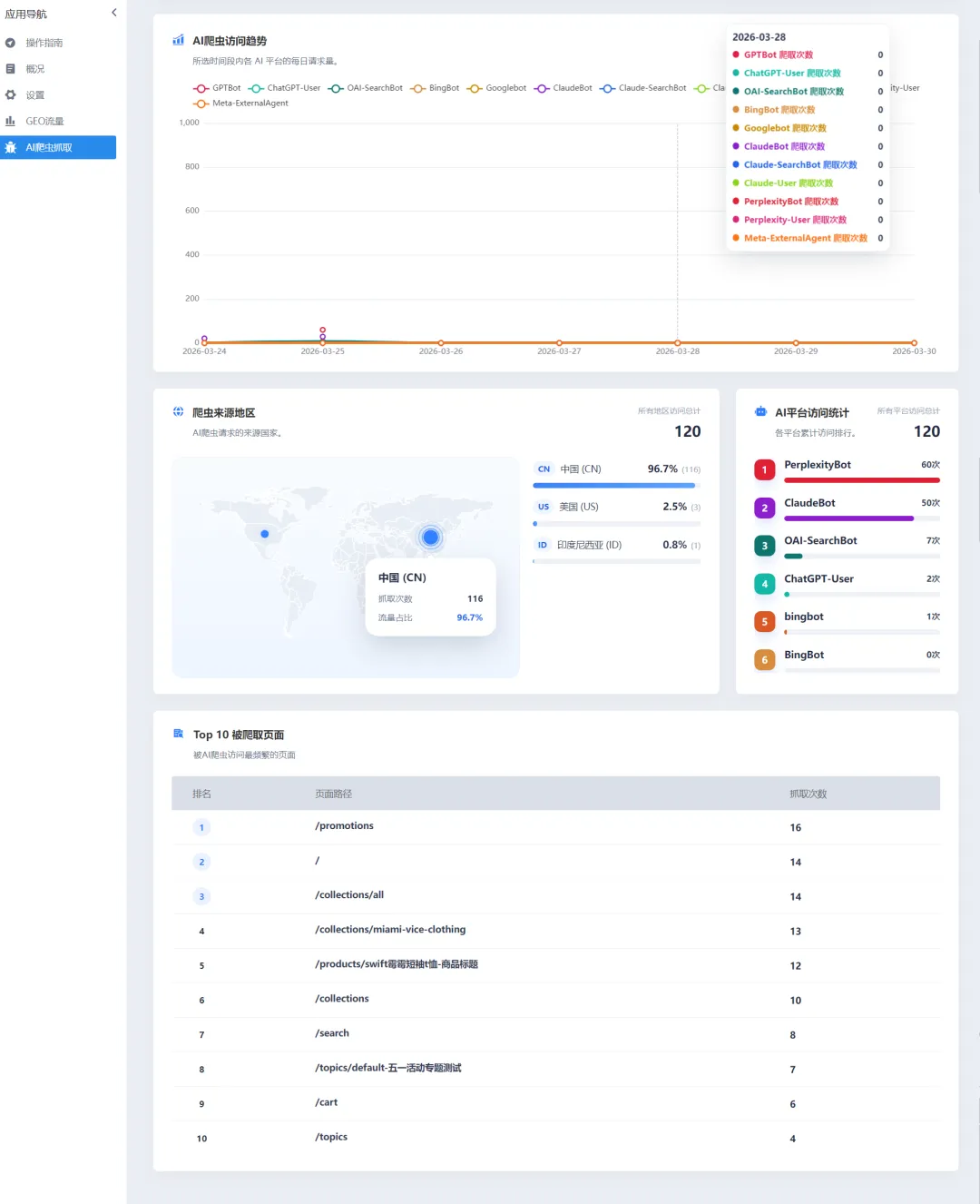 7.监控各大 AI 平台及大语言模型对您网站的抓取频率与来源。