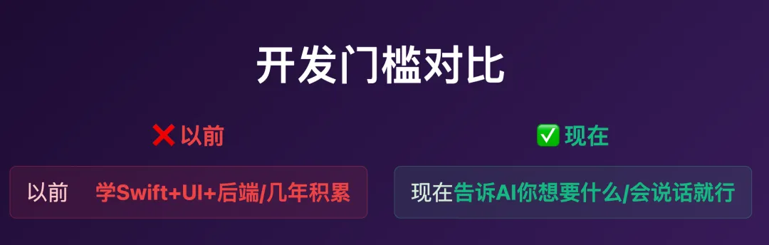 以前: 学Swift → 学SwiftUI → 学后端 → 学部署 → 做出来现在: 告诉AI”帮我做一个记账App” → 改改UI → 提交