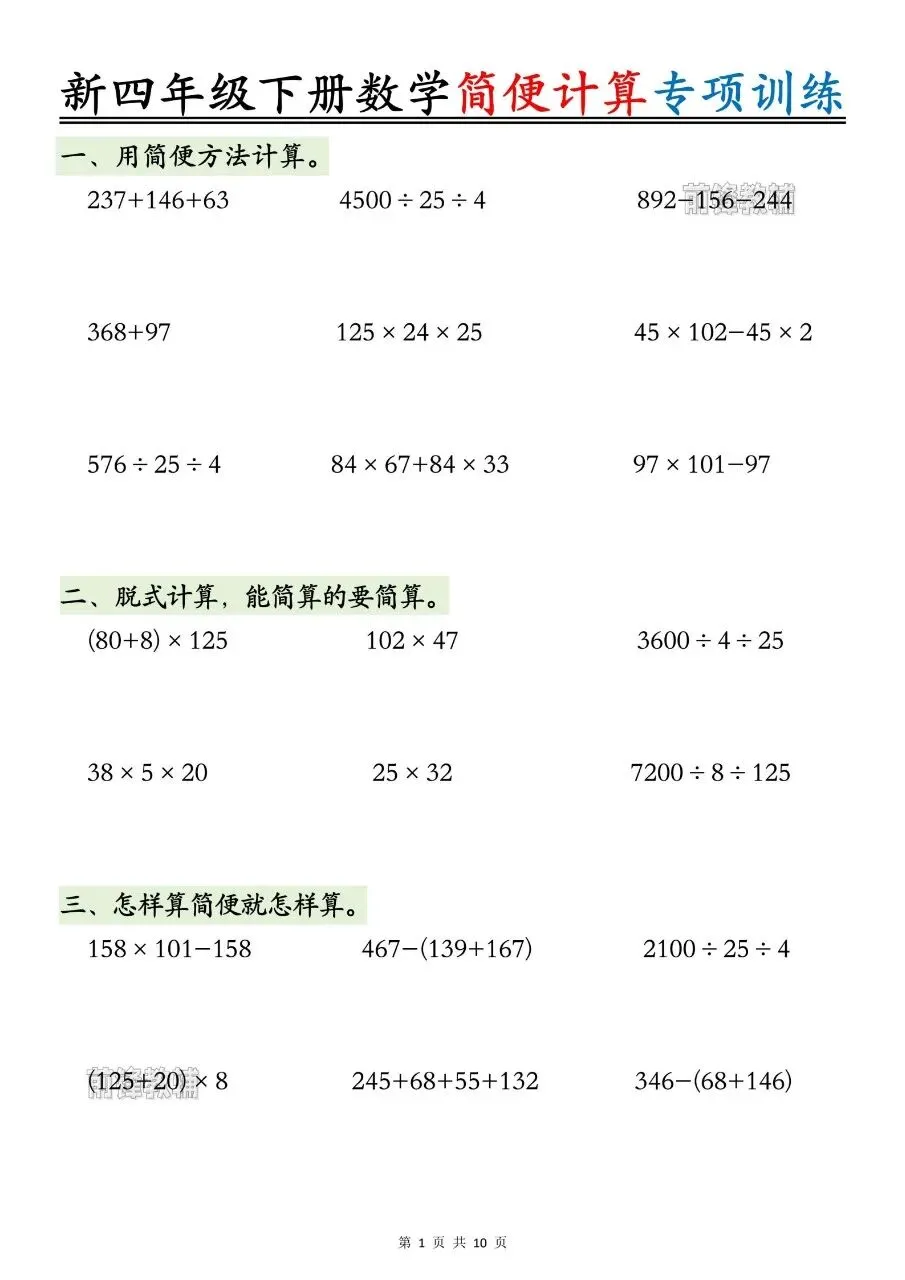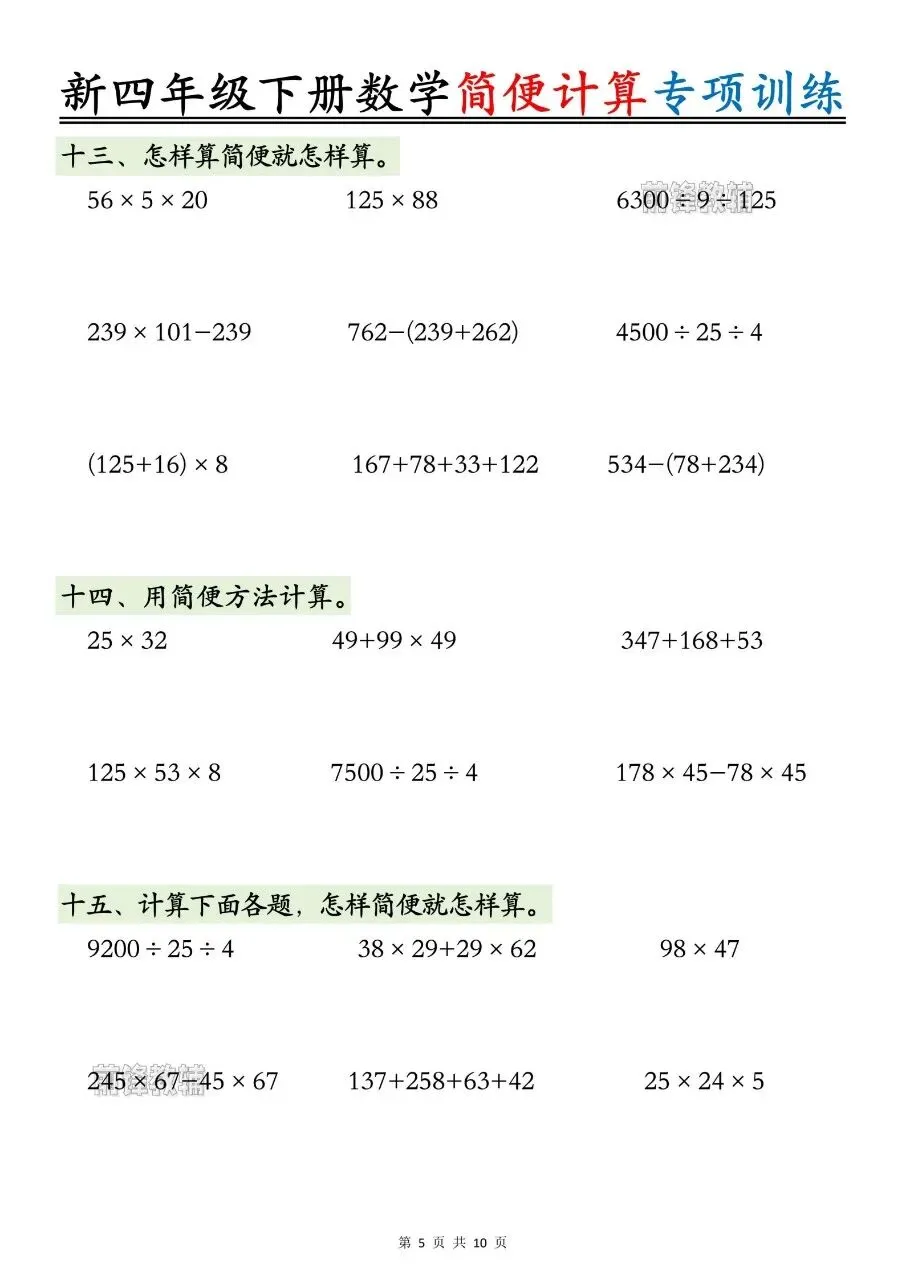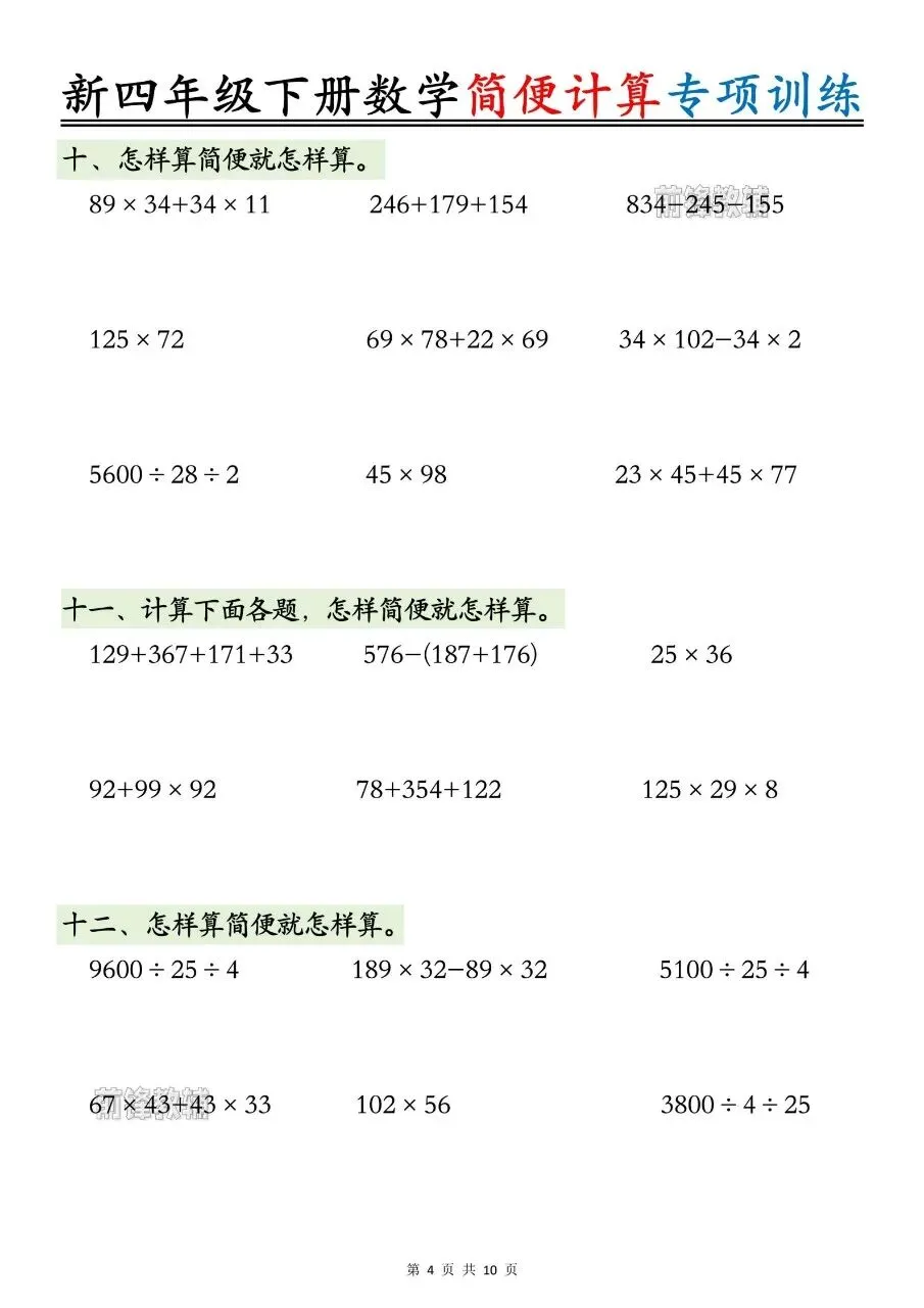 新四年级下册数学简便计算专项训练电子版免费下载!