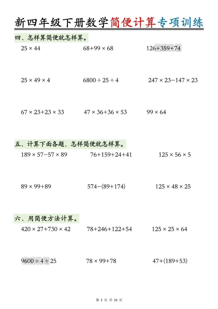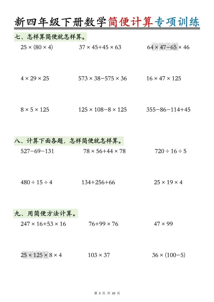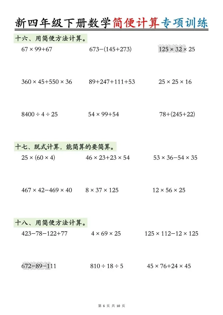 新四年级下册数学简便计算专项训练电子版免费下载!
