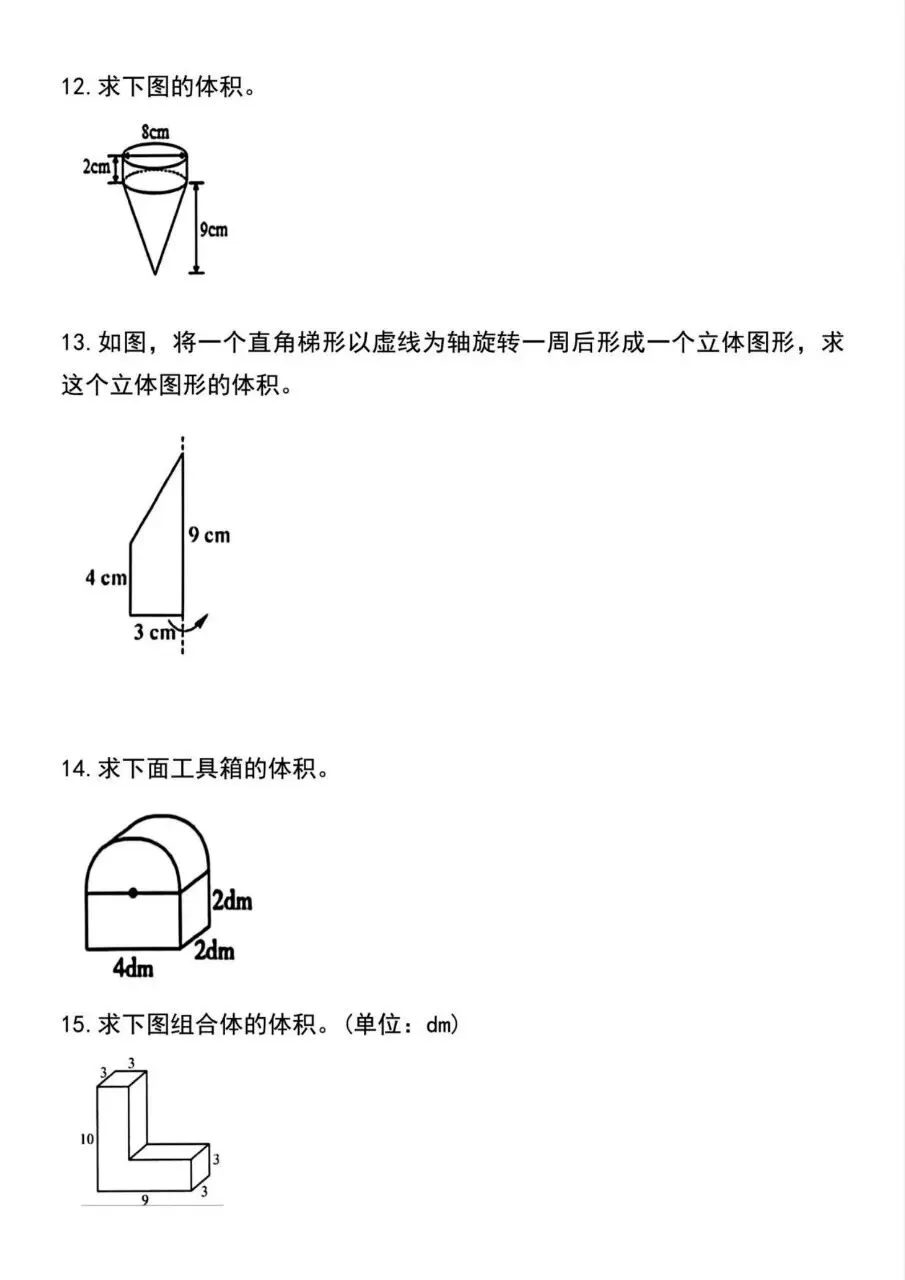 10. 容积计算:规则容器(圆柱、圆锥)用对应体积公式计算,注意单位换算。