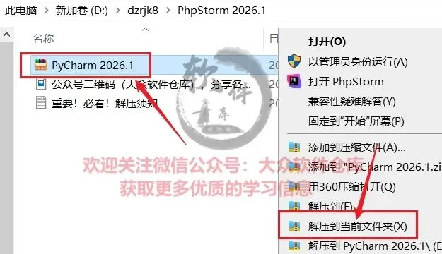 1.把资源从网盘下载到电脑上面并右键PyCharm 2026.1.exe压缩包选择解压到当前文件夹;