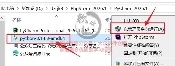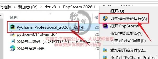 7.右键以管理员身份运行PyCharm 2026.1_x64程序;