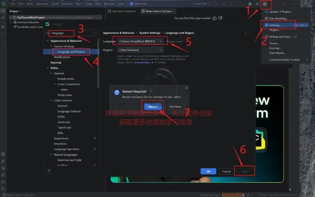 17.如果弹出语言引导界面可直接选择中文简体,没弹出界面可参考通用设置语言教程:点击右上角的设置,点击Settings,输入language查找,点击Language and Region,选择简体中文,点击下方的Apply,点击Restart。然后重新打开软件即可;