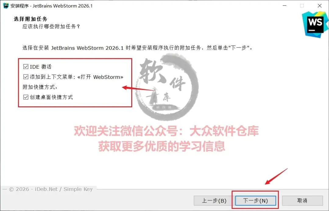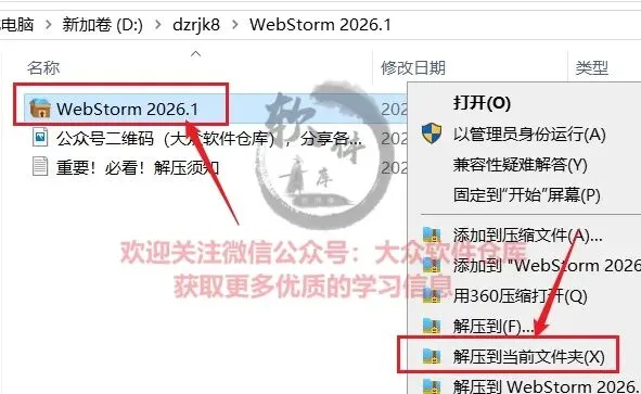 1.把资源从网盘下载到电脑上面并右键WebStorm 2026.1.exe压缩包选择解压到当前文件夹;