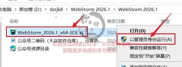 3.右键以管理员身份运行WebStorm 2026.1_x64程序;