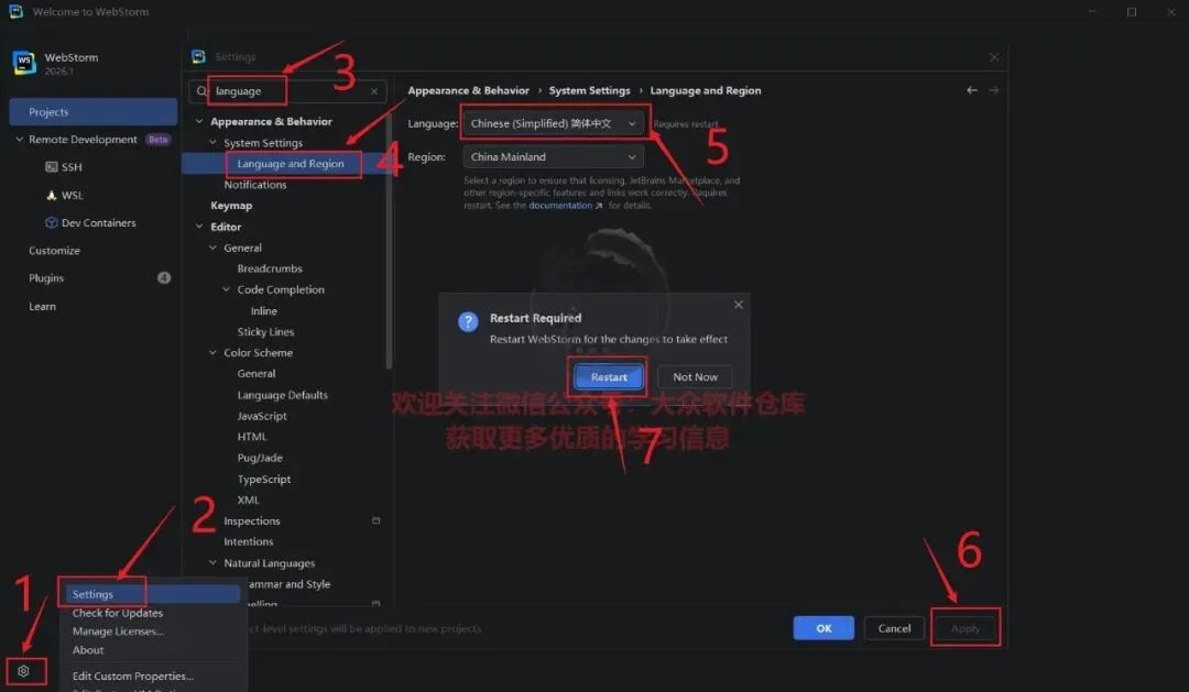 13.如果弹出语言引导界面可直接选择中文简体,没弹出界面可参考通用设置语言教程:点击左下角的设置,点击Settings,输入language查找,点击Language and Region,选择简体中文,点击下方的Apply,点击Restart。然后重新打开软件即可;