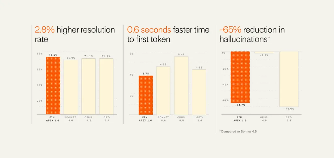 Fin 目前每周处理超过 200 万条客户问题,客户涵盖 Atlassian、Riot Games、Mercury、Polymarket 这些知名公司。而上周刚发布的 Apex 模型,在解析率、响应延迟、幻觉率和成本四个维度上,全面击败了 Anthropic 和 OpenAI 的前沿通用模型。