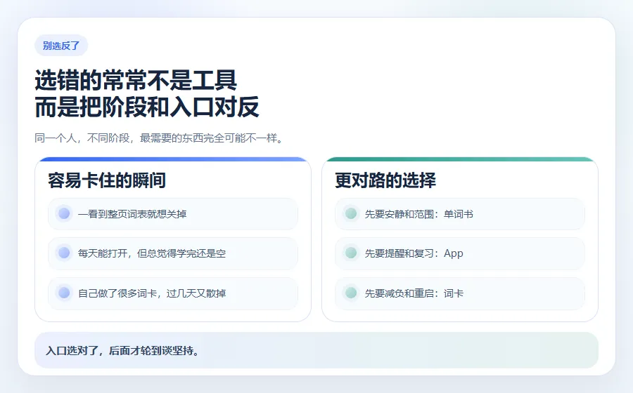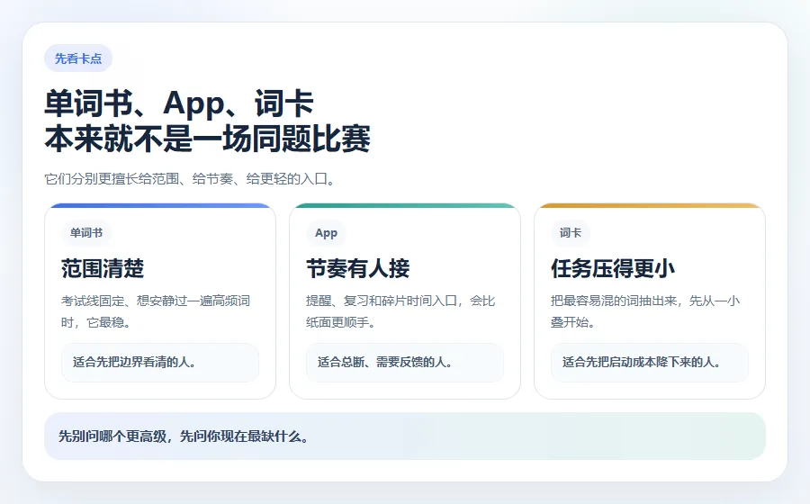 真正更容易走远的做法,通常也不是死守一种入口。刚开始可以用词卡把压力压轻,用 App 管节奏,用单词书补完整范围。等你不再只问“怎么把词看完”,而是开始在意“我到底记住没有、能不能用出来”,后面就得有更连的路径。