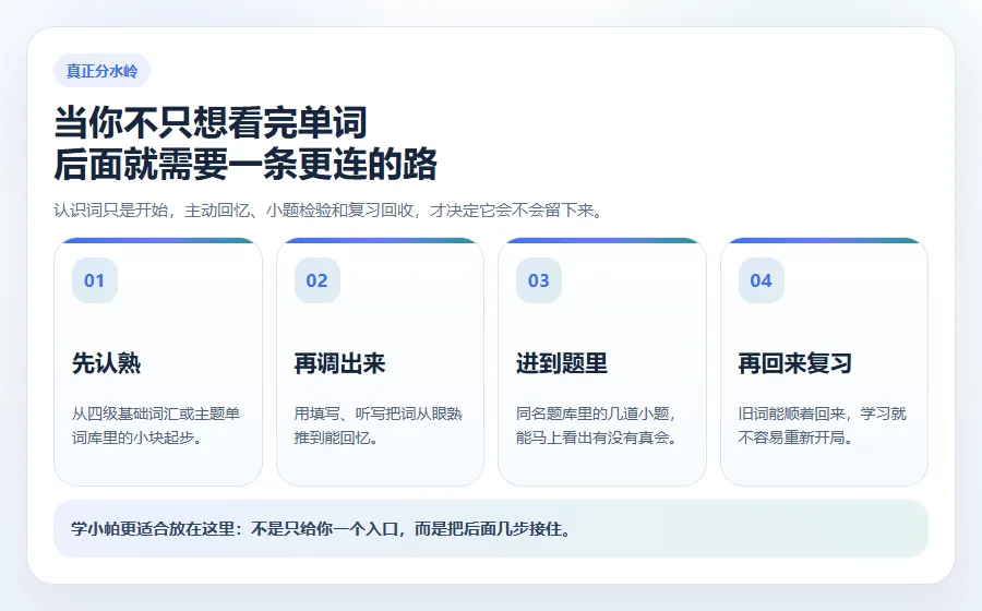 学小帕更适合放在这一步。它不是单纯替单词书、App 或词卡站队,而是把这三种入口后面缺的东西接起来。你可以先从四级基础词汇,或者主题单词库里的餐厅饮食 -> 点餐服务这种小块开始,用卡片认,再用填写和听写把词调出来,接着用同名题库里的小题看看自己是不是真的会了,后面复习也能顺着回来。