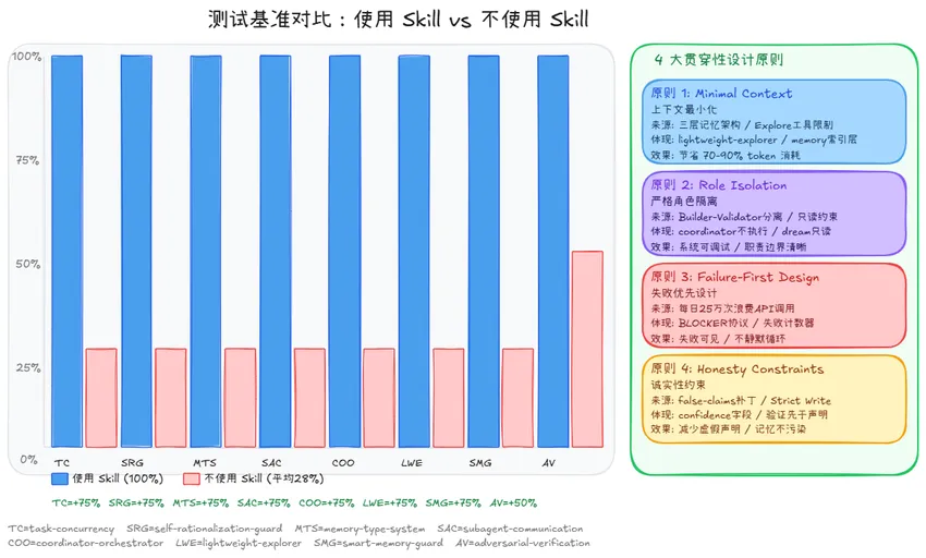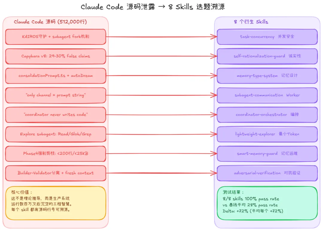 我花时间读完了核心部分,从中提炼出了 8 个 Skills。测试结论:8/8 在对抗基线测试中达到 100% pass rate (vs 基线平均 28%)。
