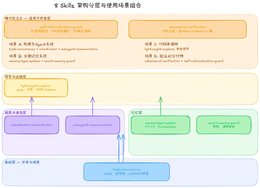 这 8 个 Skills 有清晰的层级关系,不是平等的工具集合: