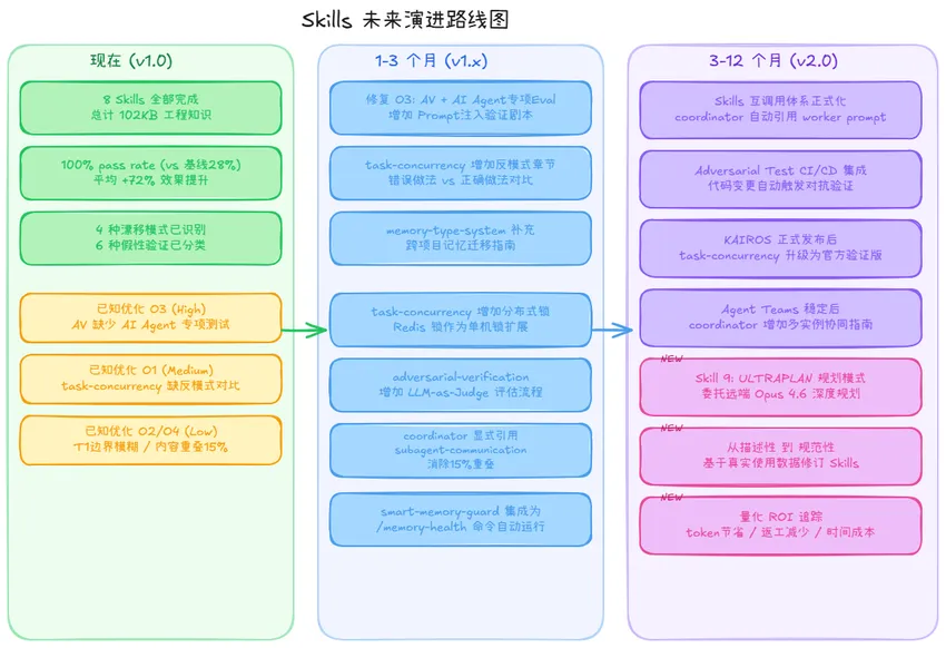 短期(1-3 个月) :修复 O1 优先级问题;为 task-concurrency 增加分布式锁(Redis 锁)扩展方案;为 adversarial-verification 增加 LLM-as-Judge 的评估者本身的验证流程。