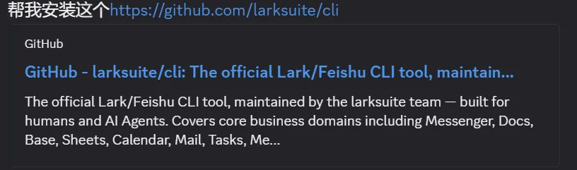 1、如果你和我一样是个懒人不想折腾命令行,最简单的做法就是直接把飞书 CLI 的地址丢给你的 Agent,让它自己装。咒语如下: