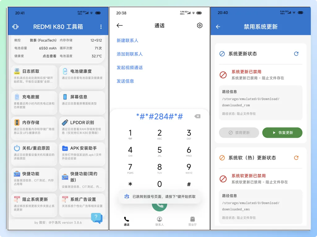 澎湃工具箱是一款由酷安大佬@于逸风 开发的 澎湃工具箱,免 Root 实现小米/红米手机的深度信息查询与系统管理。拨号界面输入 *#*#284#*#* 触发系统日志抓取,生成 Bug 报告文件,通过抓取的日志可以查看电池健康度、循环次数、屏幕供应商、内存/存储规格等底层数据信息。还可以实现很多系统隐藏的功能,以及永久屏蔽系统升级/一键恢复更新。