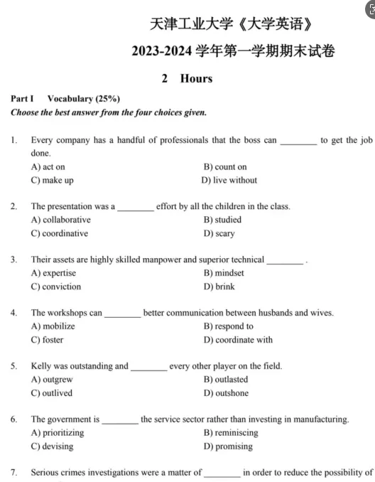 天津工业大学大学英语期末试题,可打印 获取更多考研资料可加小编QQ:3542263029或者v信kyzlfx 先点“赞+在看”联系客服即可免费赠送公共课(政治英语数学)资料 其他院校陆续更新中…….有需要联系客服留言即可 更多真题资料会第一时间为大家推送 还有其他年份,可联系客服详询 01 部分截图如下🔥 温馨服务 免责申明:资料整理于网络如有侵权请告知删除 长按并识别下方二维码关注公众号,不定时发放考研福利哦 扫一扫添加微信好友,获取更多考研信息哦~