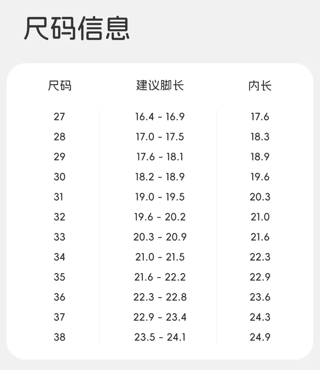 尺码也都是从27到38码,基本覆盖幼儿园大班到小学六年级。