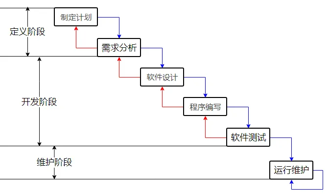 将软件生命周期划分为制定计划, 需求分析, 软件设计, 程序编写, 软件测试 和 运行维护六个基本活动, 并且规定了它们自上而下, 相互衔接的固定次序如同瀑布流水, 逐级下落