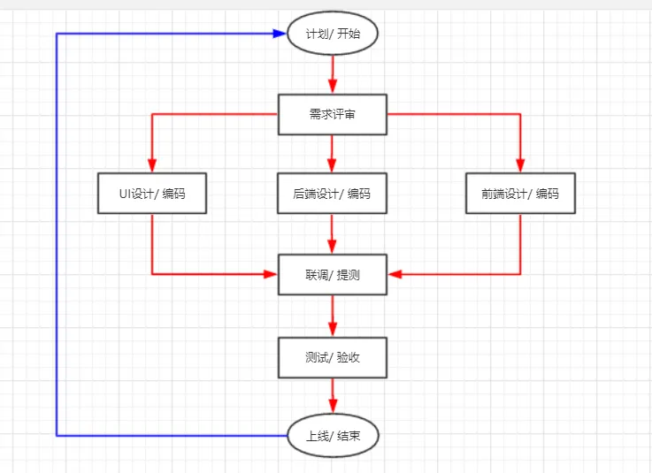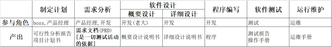 概念: 以”编码”为黄金分割线, 把整个过程分为开发和测试, 并且开发和测试之间是串行的关系