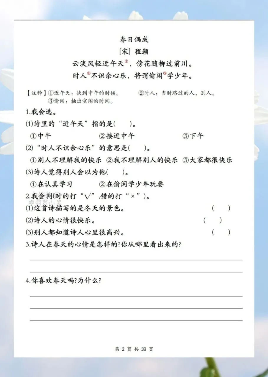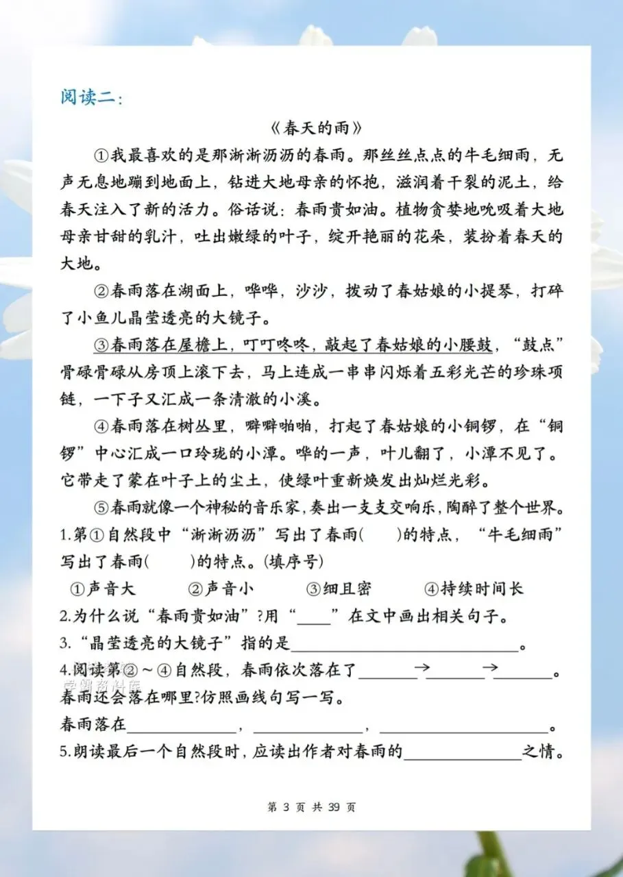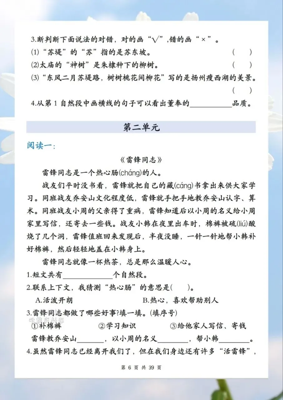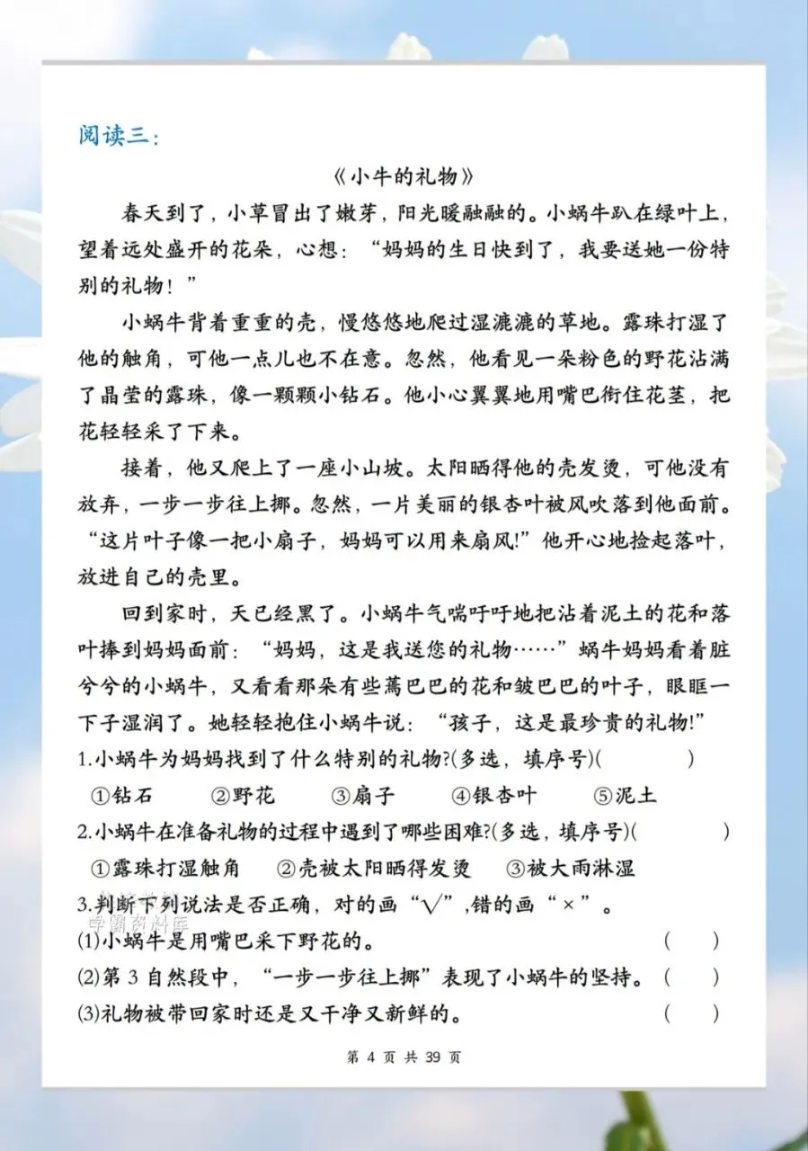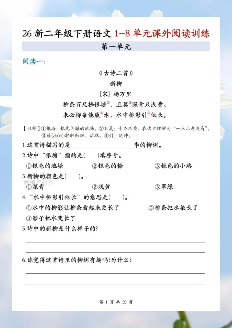 今日分享2026二年级下册语文1-8单元课外阅读训练共计 39 页。课外阅读训练让孩子阅读短文后,根据短文内容回答短文习题。需要的家长抓紧打印出来,让孩子在利用课余学一学、背一背,扎实基础。
