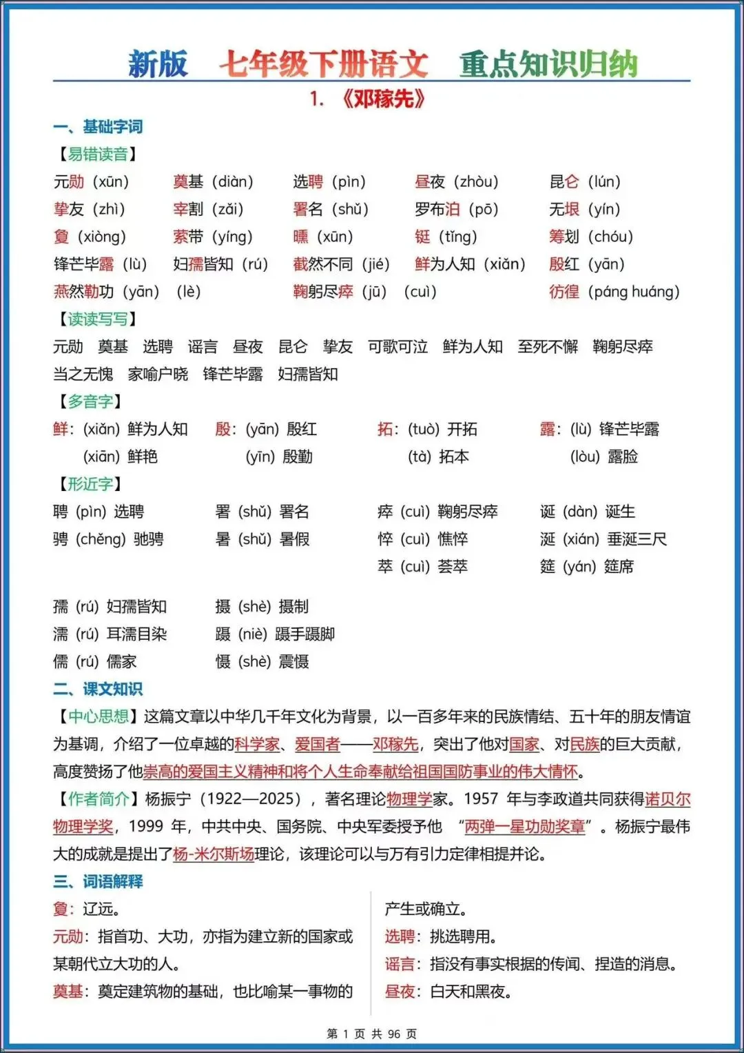以下就是七年级下册语文重点知识全归纳,涵盖基础字词、课文主旨、人物形象、文言常识与核心答题技巧。希望同学们能够对照梳理、扎实记忆、灵活运用,建议家长收藏