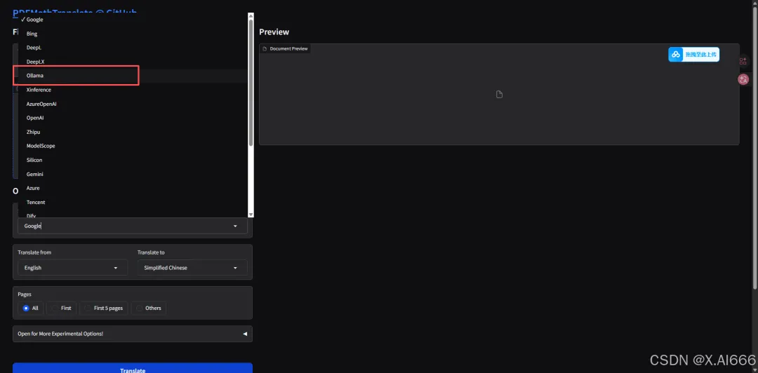 他可以选择多个供应商作为翻译解析,最重要的一点可以离线部署支持用ollama本地模型来进行翻译,这是其他线上翻译无法比拟的私密性,因为很多公司的文件不允许上传外部网络,这个工具就很好用了。这里我演示用ollama中的huihui_ai/hy-mt1.5-abliterated:7b进行翻译,这款模型是翻译界的强者,是腾讯发布的专用翻译模型,我们先需要用ollama下载这个模型