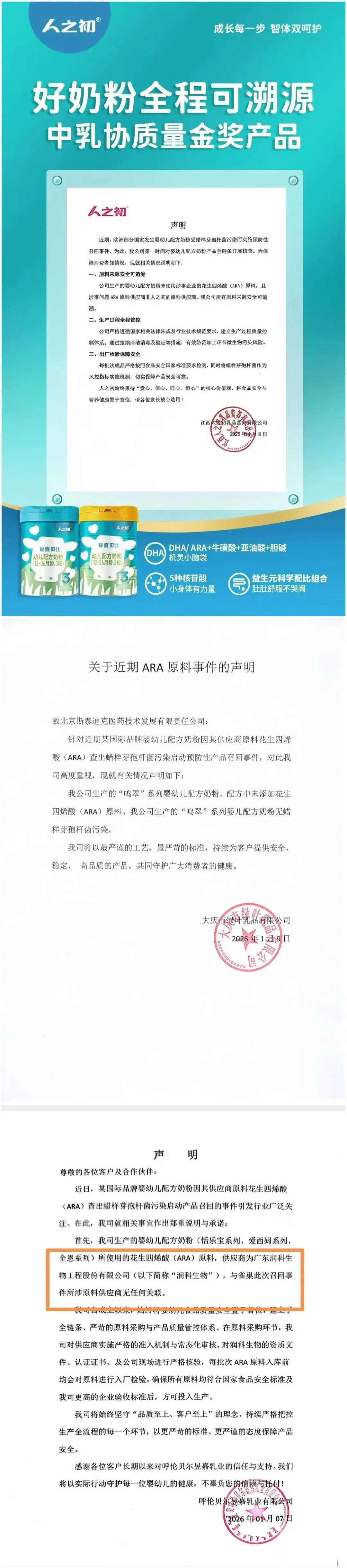 2026年1月,雀巢集团因供应商提供的花生四烯酸油(ARA)原料可能存在质量问题,在全球启动婴幼儿配方奶粉预防性召回。此次事件仅涉及雀巢集团旗下特定批次产品,其他奶粉品牌均未受影响,消费者无需过度担忧。