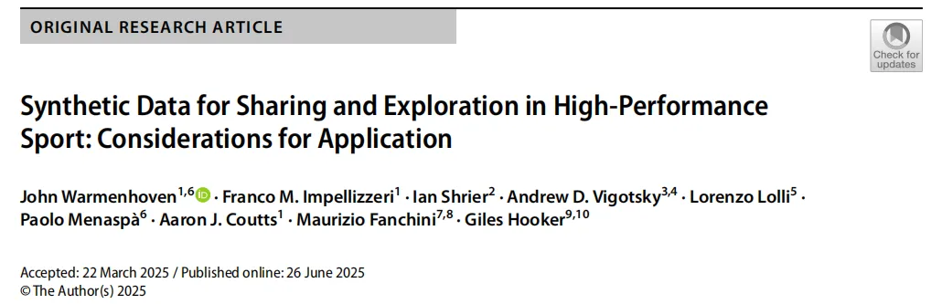 该文献是发表于Sports Medicine(IF=9.4)的《Synthetic Data for Sharing and Exploration in High‑Performance Sport: Considerations for Application》–高性能运动中用于共享和探索的合成数据:应用考量