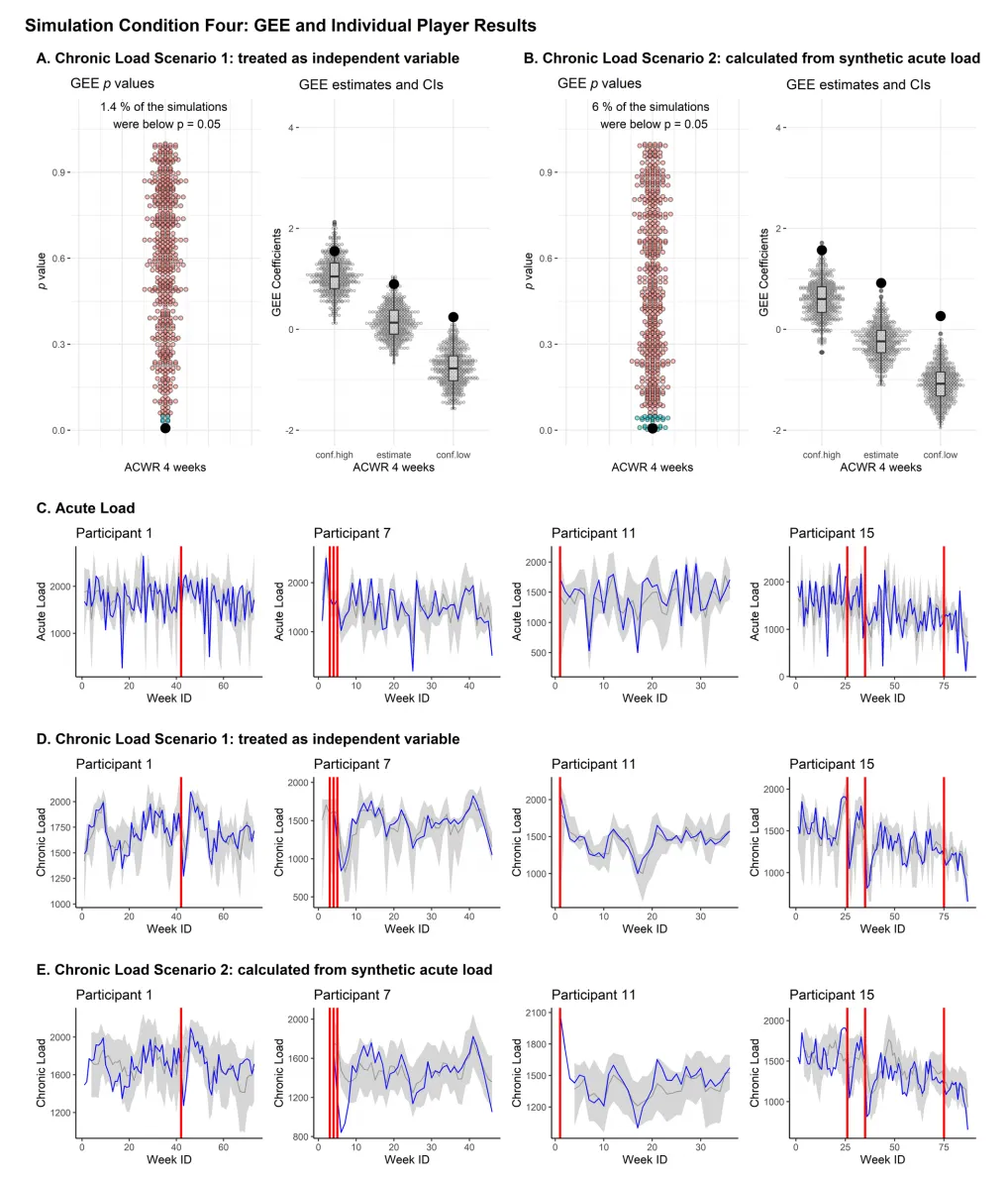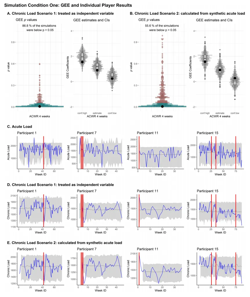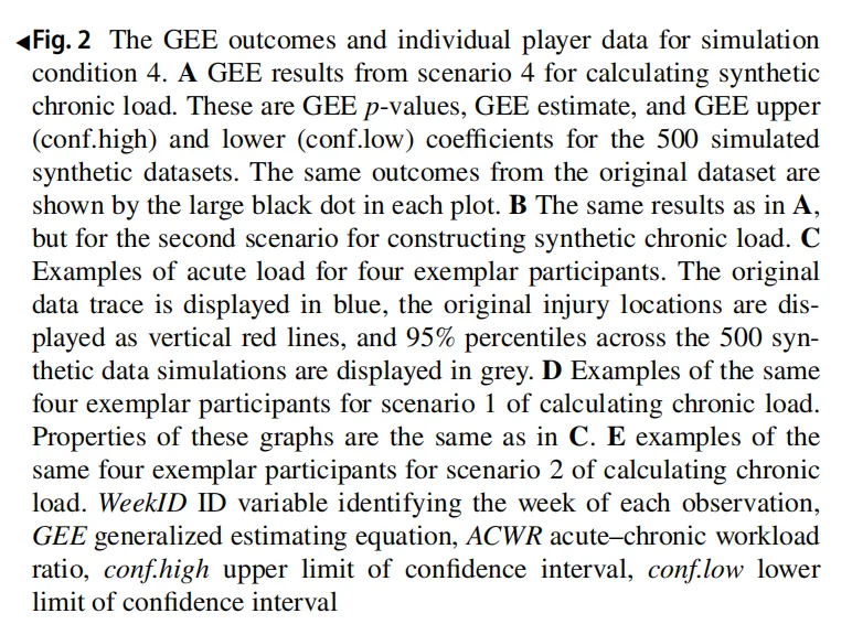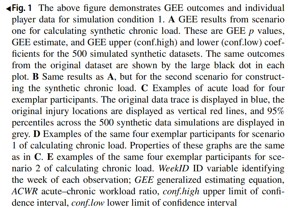 图1(Fig.1)模拟条件 1 的 GEE 结果与运动员个体数据:该图显示基础模拟条件下合成数据能精准复刻原研究 GEE 分析结果,但因未纳入时间预测变量,无法保留运动员个体训练负荷的纵向时间趋势,表现为负荷数据的置信区间极宽。