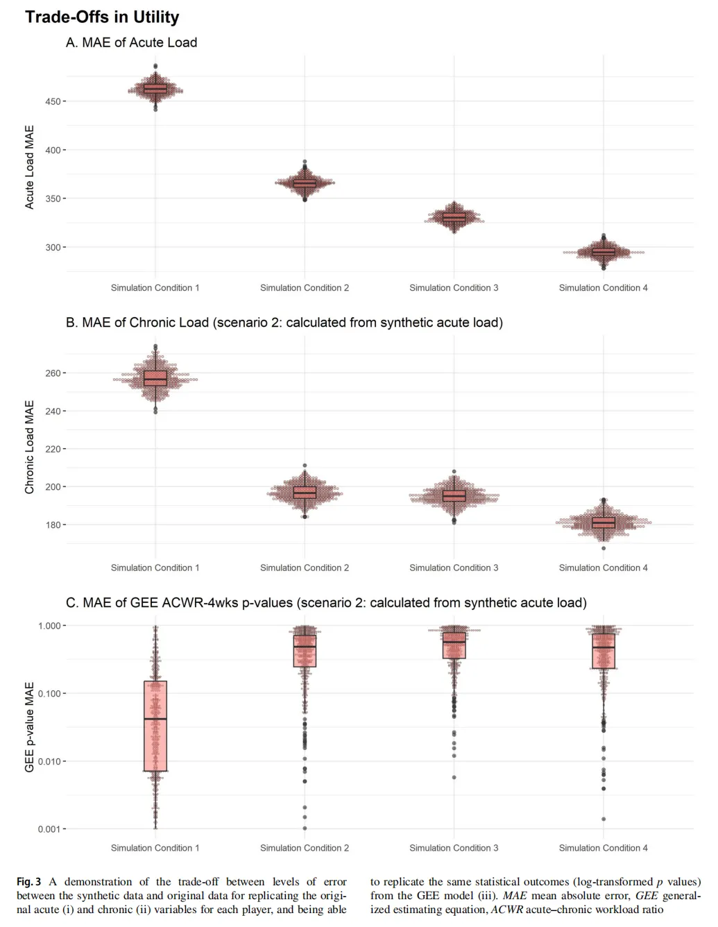 图3(Fig.3)效用间的权衡关系:该图直观呈现了合成数据生成过程中的核心权衡,随着生成模型中加入更多时间预测变量(从条件1到条件4),合成数据在复现个体负荷时间轨迹方面的精度不断提高(图3A、3B误差下降),但其在复现原始研究统计结果(GEE分析)方面的能力却不断下降(图3C误差上升)。