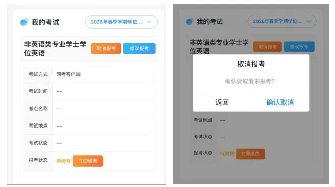 ②若取消支付,则为“待缴费”状态,视为未报考成功,需完成缴费;“待缴费”状态可修改报考信息,修改确认后支付报考费用,即完成报名;如放弃报考,可取消报考。