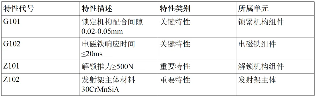 某型导弹发射架,经过特性分析识别出以下关键特性:
