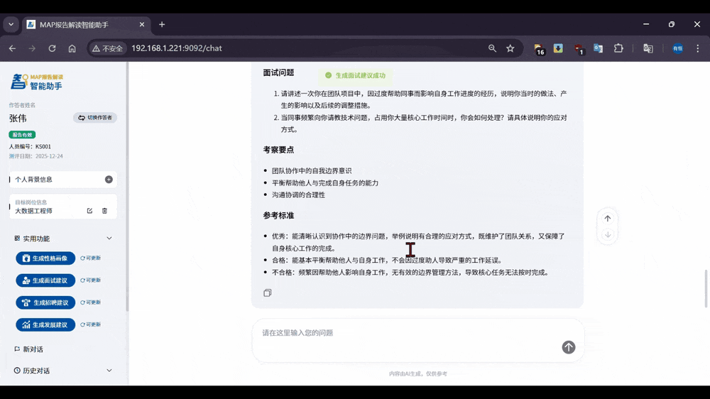 智能生成针对性面试问题,融合测评结果与岗位需求,提升面试质量与效率