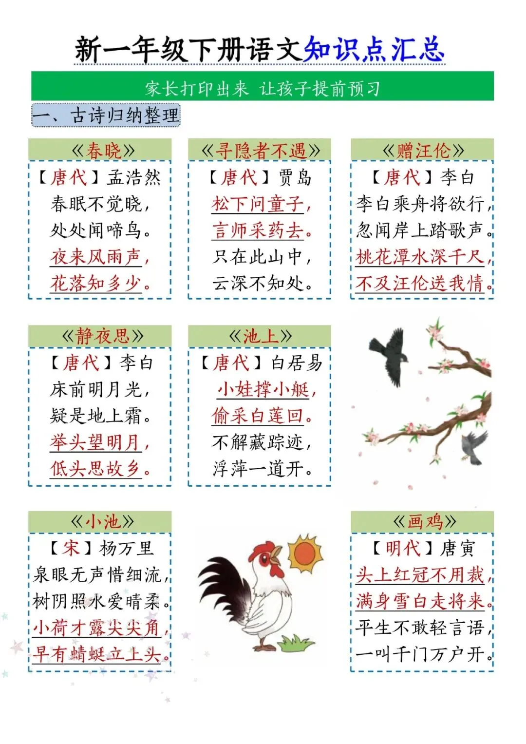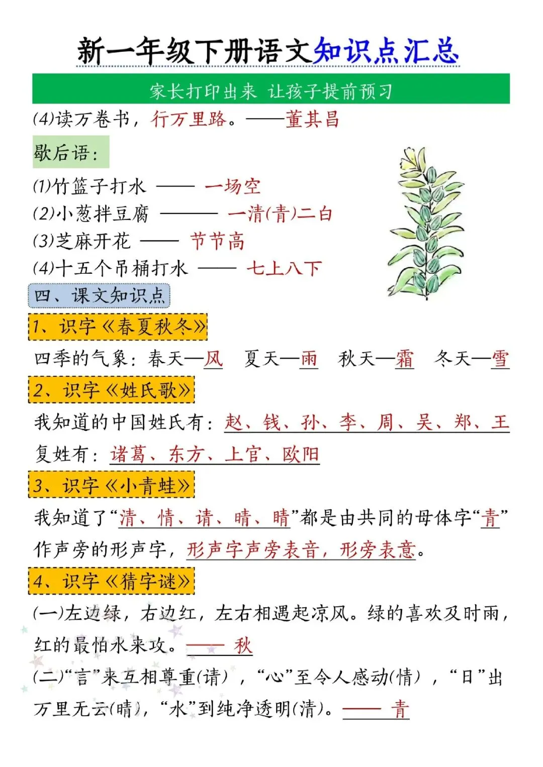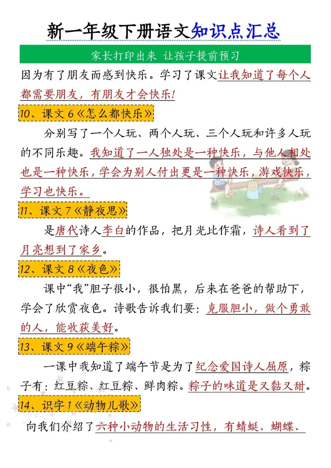 一年级下册语文知识点汇总,重点归纳总结可打印