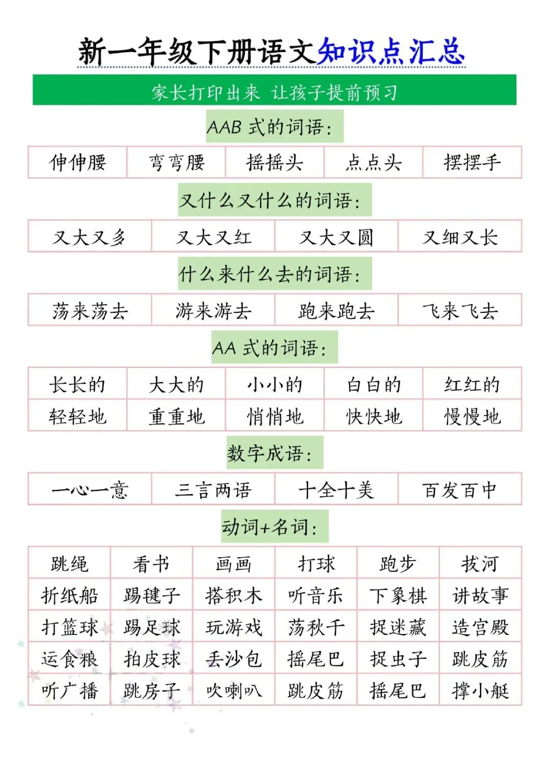 这份资料把一年级下册语文的核心知识点全梳理好了,包含必背古诗、各类词语搭配和句式、谚语歇后语,还有每篇课文的重点考点和中心思想,内容特别全面。不管是课前预习让孩子了解重点,还是课后复习巩固知识,都特别合适,孩子照着学能夯实语文基础。