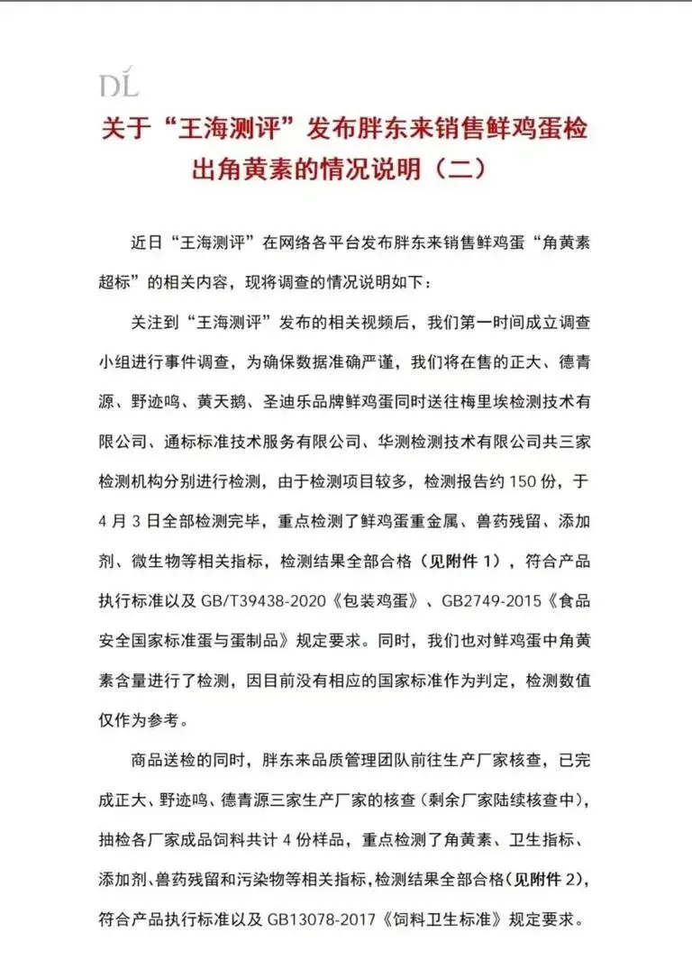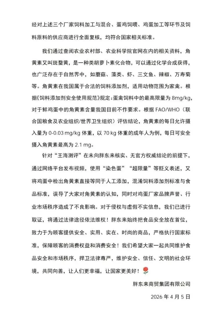 4月5日,胖东来商贸集团有限公司通过其抖音官方账号发布《关于“王海测评”发布胖东来销售鲜鸡蛋检出角黄素的详细情况说明》。