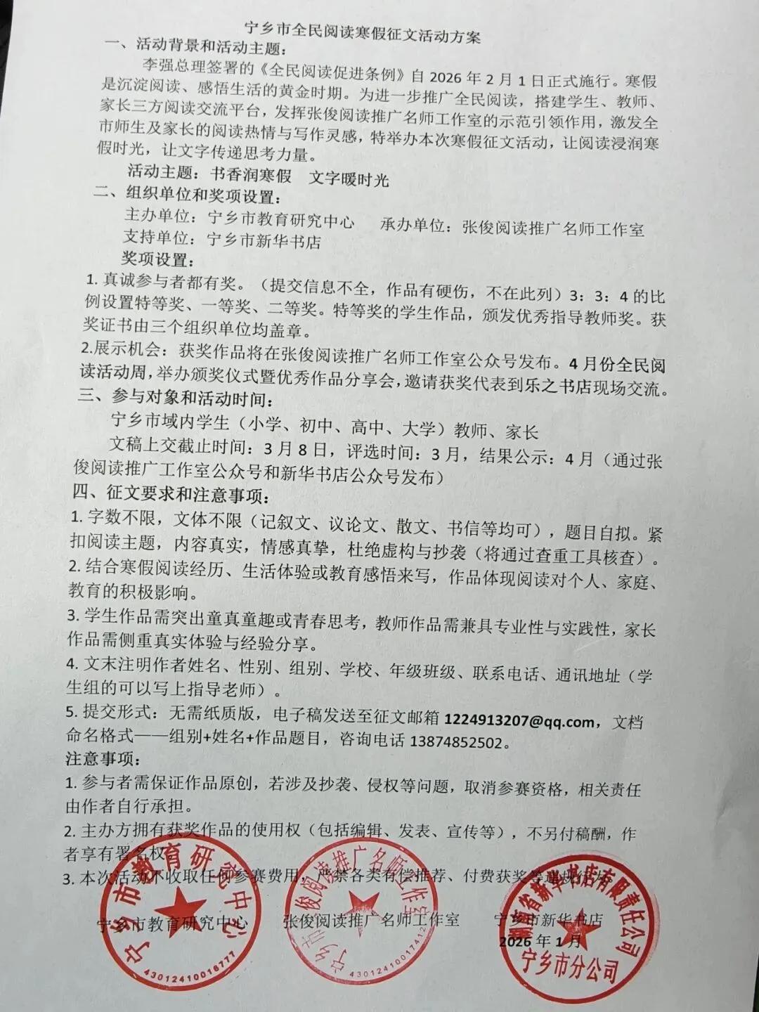 宁乡市全民阅读寒假征文3月8日截止,收到文章爆满。因为数量太多,很多发送不规范,3月份都在下载、收集、整理中,再分成人组、初高中大学组、小学组进行评审,争取4月中上旬出结果并进行公示,全民阅读活动周的时候颁发荣誉证书。