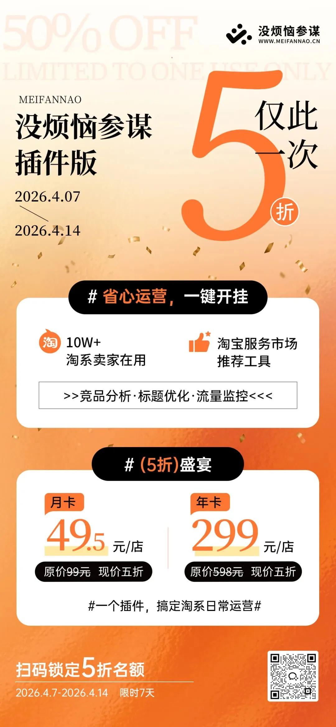 淘系卖家注意了!没烦恼插件专属福利重磅来袭,限时五折优惠,数据分析、竞品洞察、流量优化……全搞定,效率直接拉满!