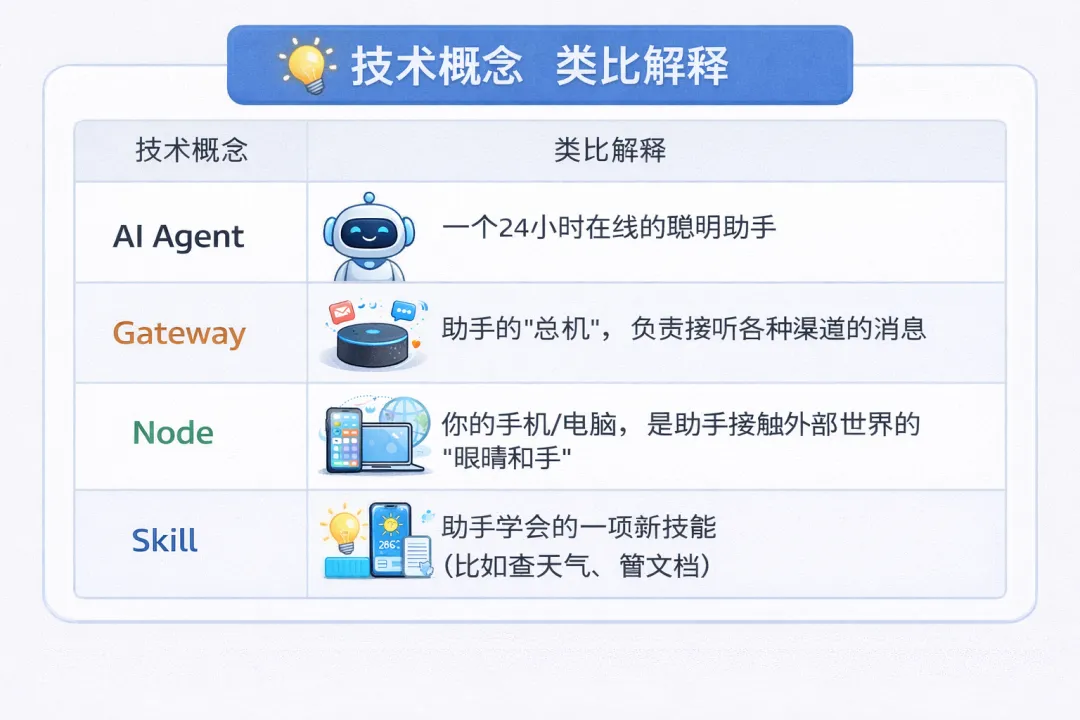 • Node — 类比人的手。叫节点工具调用器(OpenClaw 可以使用的设备,如电脑、手机)。 -