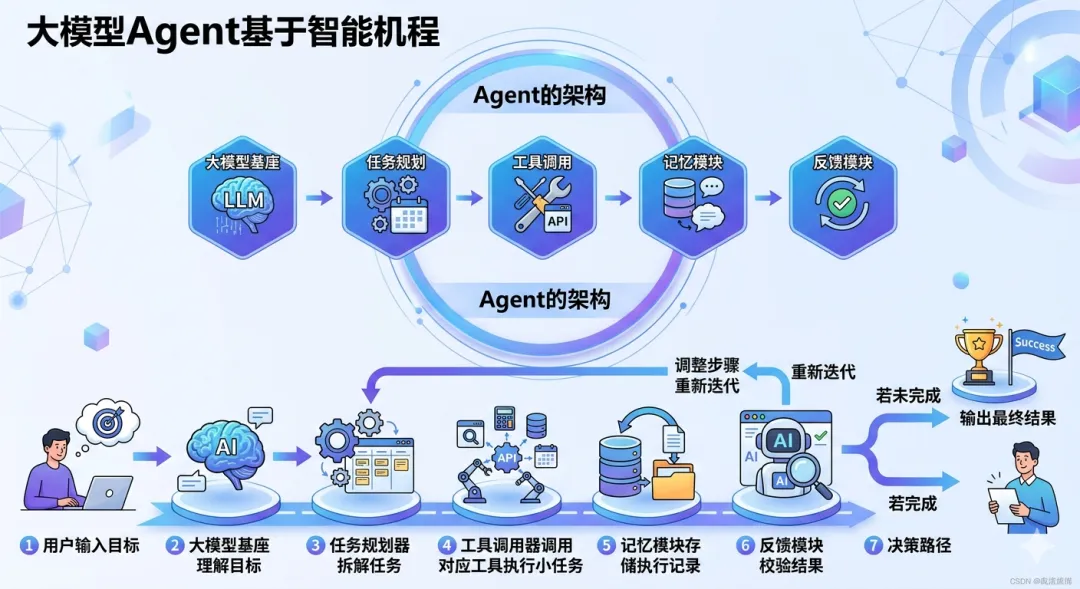 大模型基座 → 任务规划 → 工具调用 → 记忆模块 → 反馈模块。